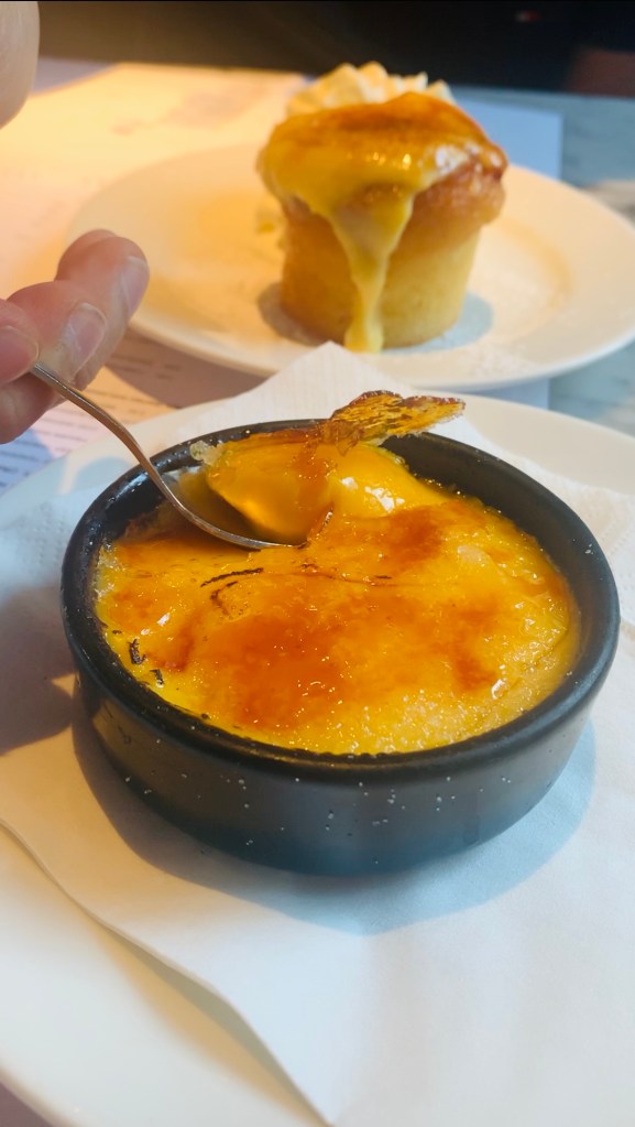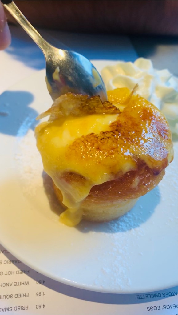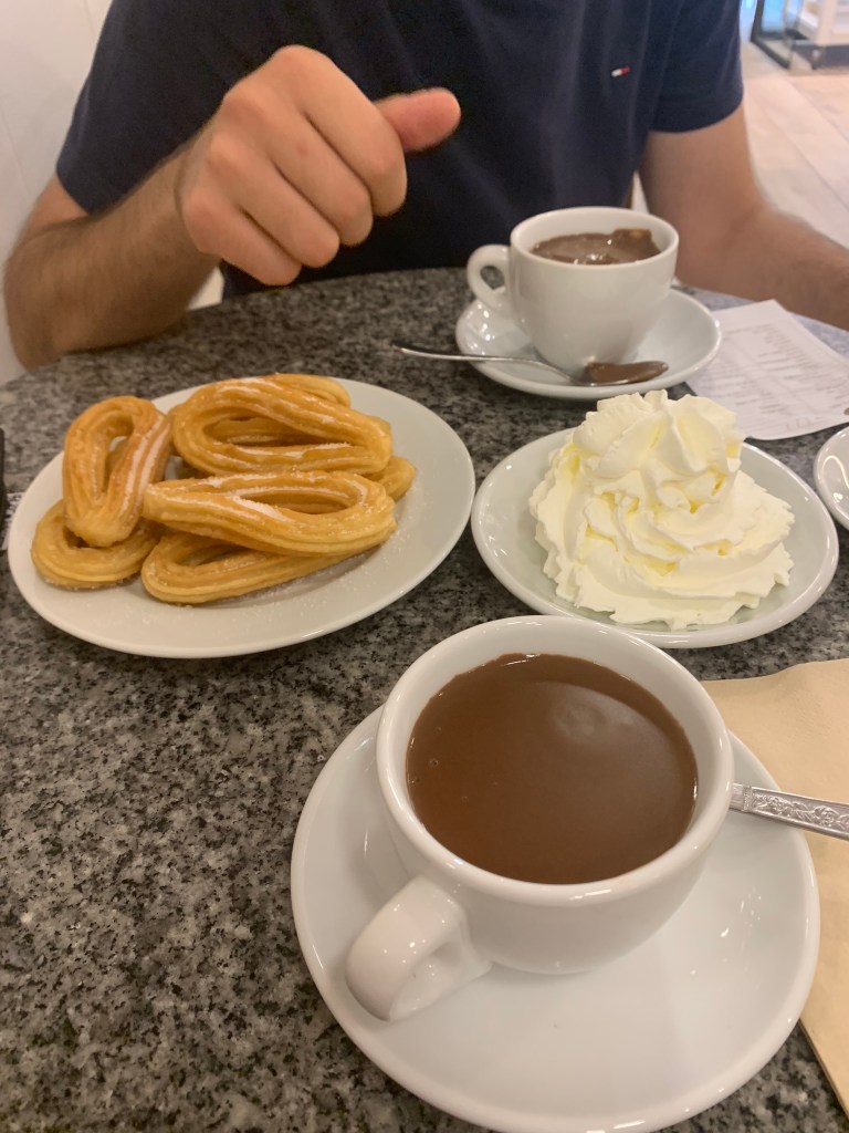 Tot în zona El Gòtic am găsit o xurrerie, să mănânc mult așteptatele churros, care în Mamaia se serveau în sombrero de carton și pline de ulei, cu sosuri lângă. Churros sunt gogoși spaniole, care se servesc cu topping de ciocolată sau simple, cu zahăr și scorțișoară. Noi am primit și frișcă alături de ele. Dacă tot suntem la capitolul dulciuri, iată încă două pe care le-am încercat – divina cremă catalană și un fel de brioșă cu cremă deasupra și zahăr ars, servită cu frișcă, care nu ne putem aminti cum se numea, dar tind să cred că este un fel de roscon de reyes adaptat.